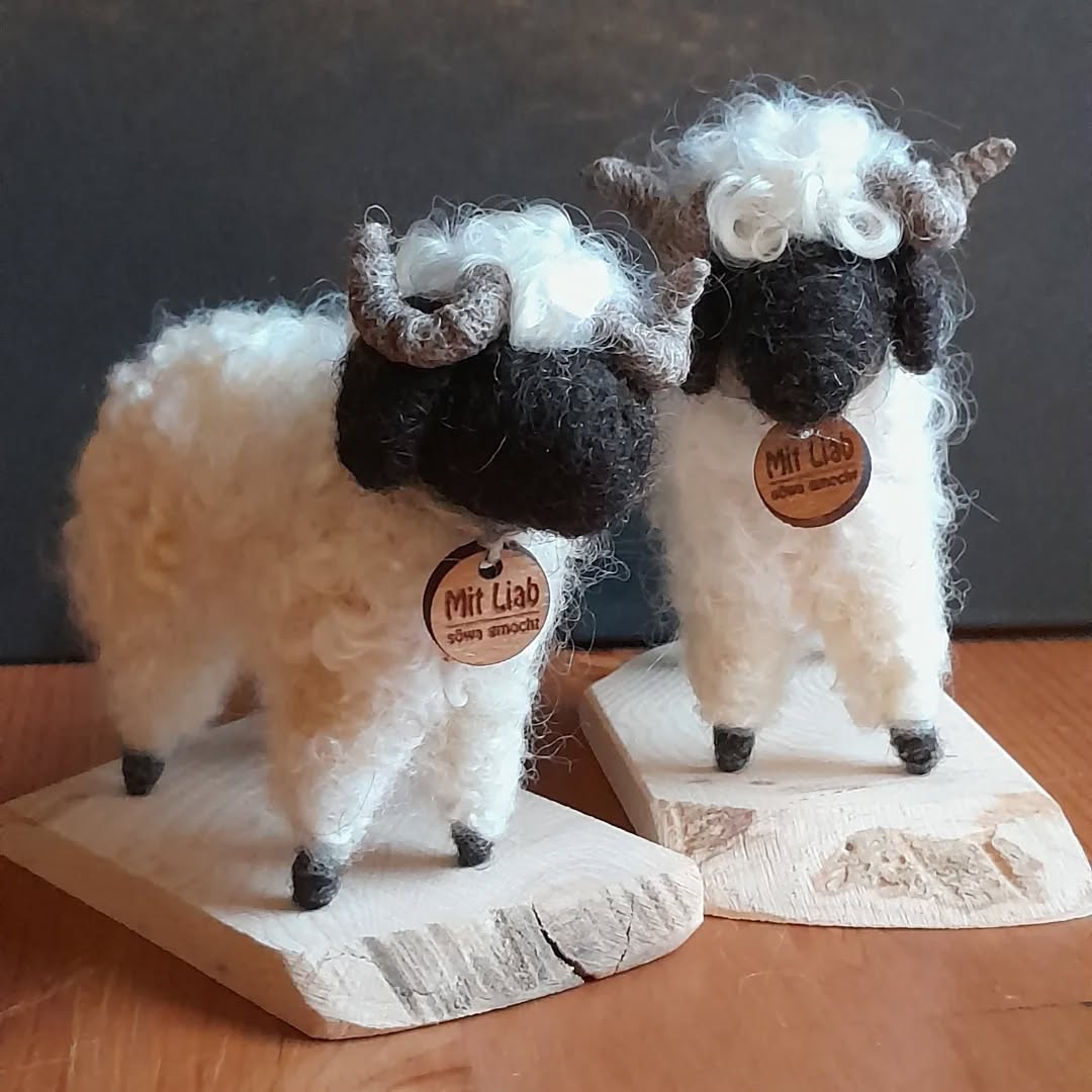 … nadelgefilzte Walliser Schwarznasen  aus österreichischer Schafwolle und Walliser-Wolllocken.